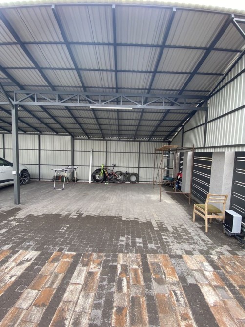 На вулиці навіс 6 на 25. Вміщається парковка 8 авто. Ворота відкатні, автоматичні. Є генератор німецький, який працює на газу та на бензині.