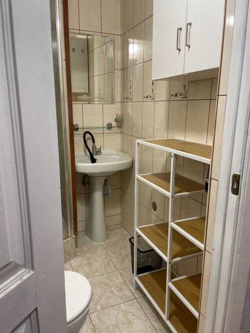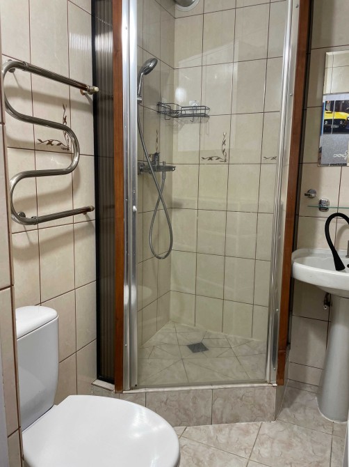 Санвузол: Душова кабіна, умивальник, унітаз, місткі стелажі, сушка для рушників.