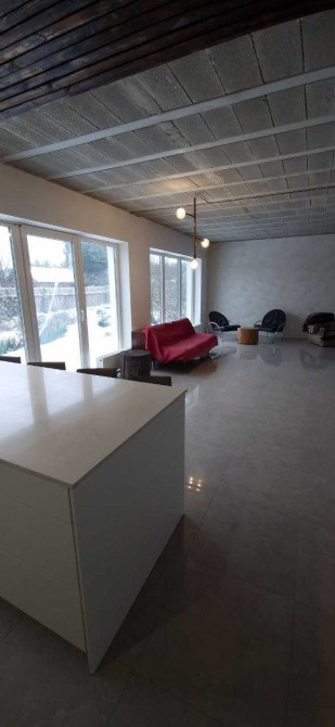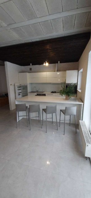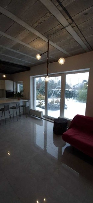Будинок двоповерховий, виконаний у стилі мінімалізм, теплий, з керамоблоку, загальною площею 180 кв. м. Має 3 спальні, оптимально розташовані за сторонами світу, 2 санвузли, кабінет, гардеробні кімнати, котельню та простору студію площею 60 кв. м (їдальня + кухня + вітальня).