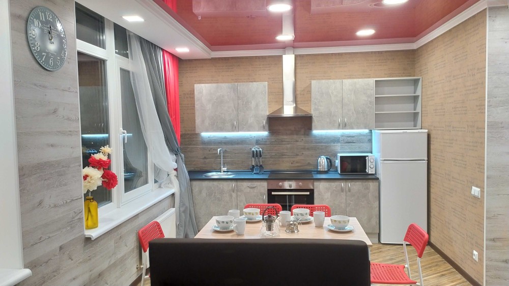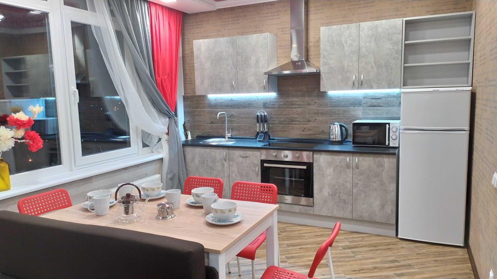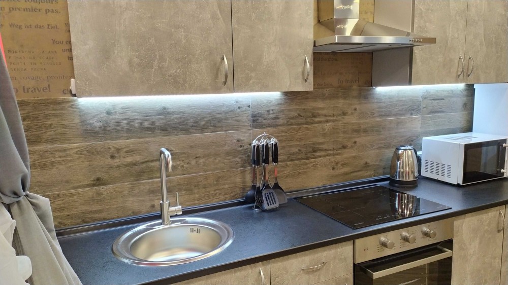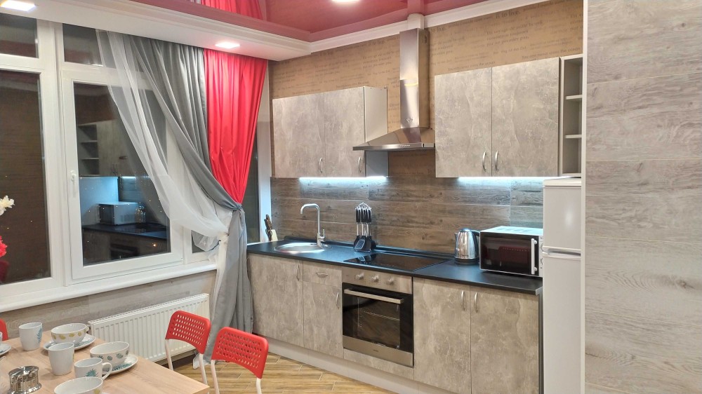 Кухня оснащена холодильником, електродуховкою, сенсорною варильною поверхнею, витяжкою та всім необхідним посудом.