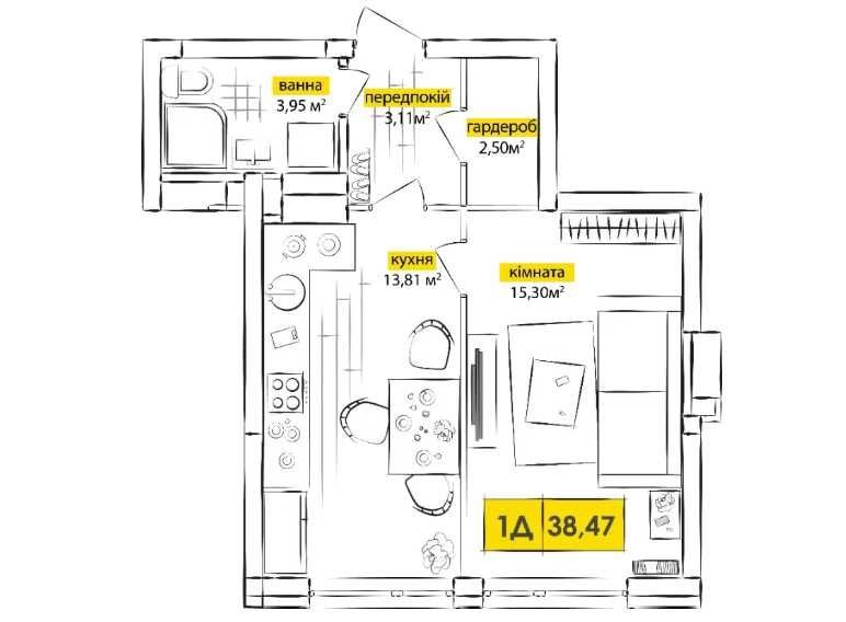Продається сучасна 1-кімнатна квартира площею 38.96 м² у будинку №1 — світла, комфортна та повністю готова до ваших дизайнерських ідей.