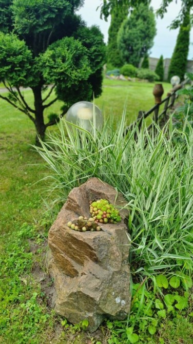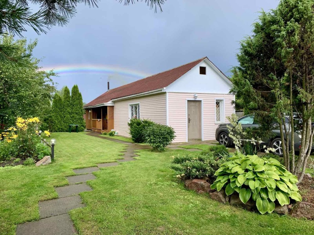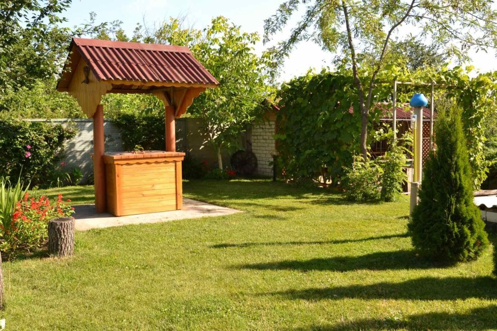 На подвір’ї — хвойні дерева, квіти, луг і ставок поруч.
