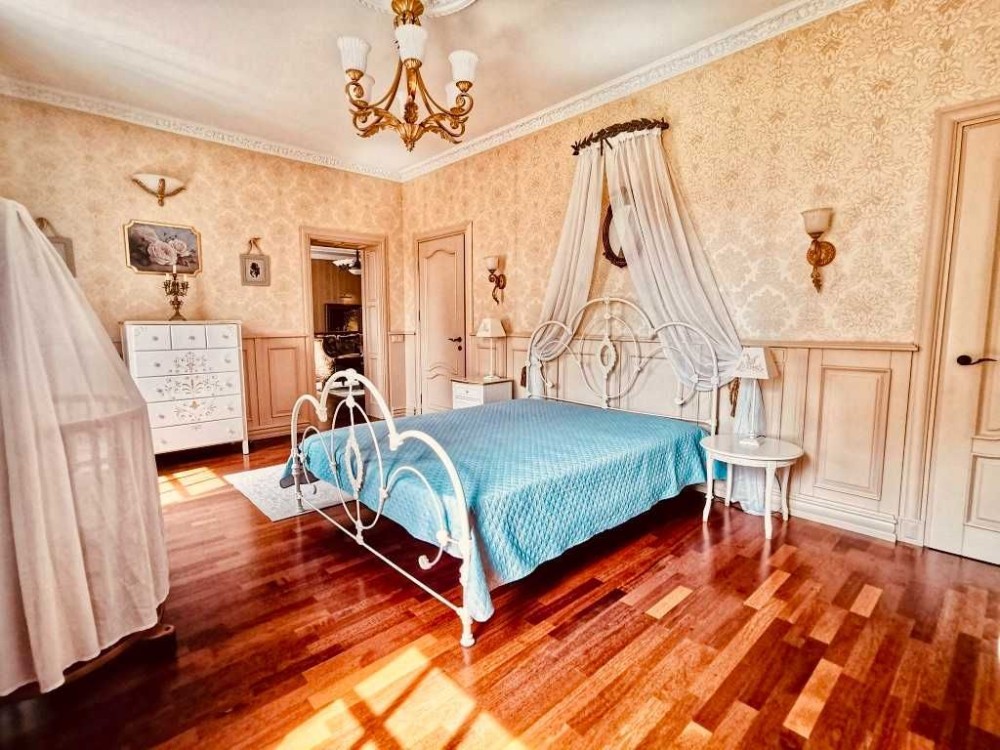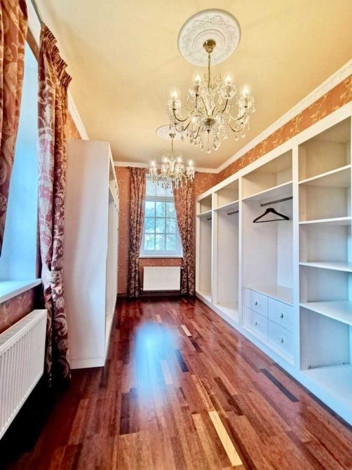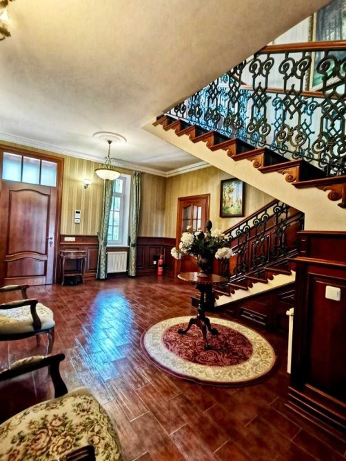 Другий поверх: просторий хол з терасою, 3 окремі кімнати, кожна кімната з власною гардеробною та ванною, на підлозі другого поверху паркетна дошка «Гевея», стіни декоровані молдингами.