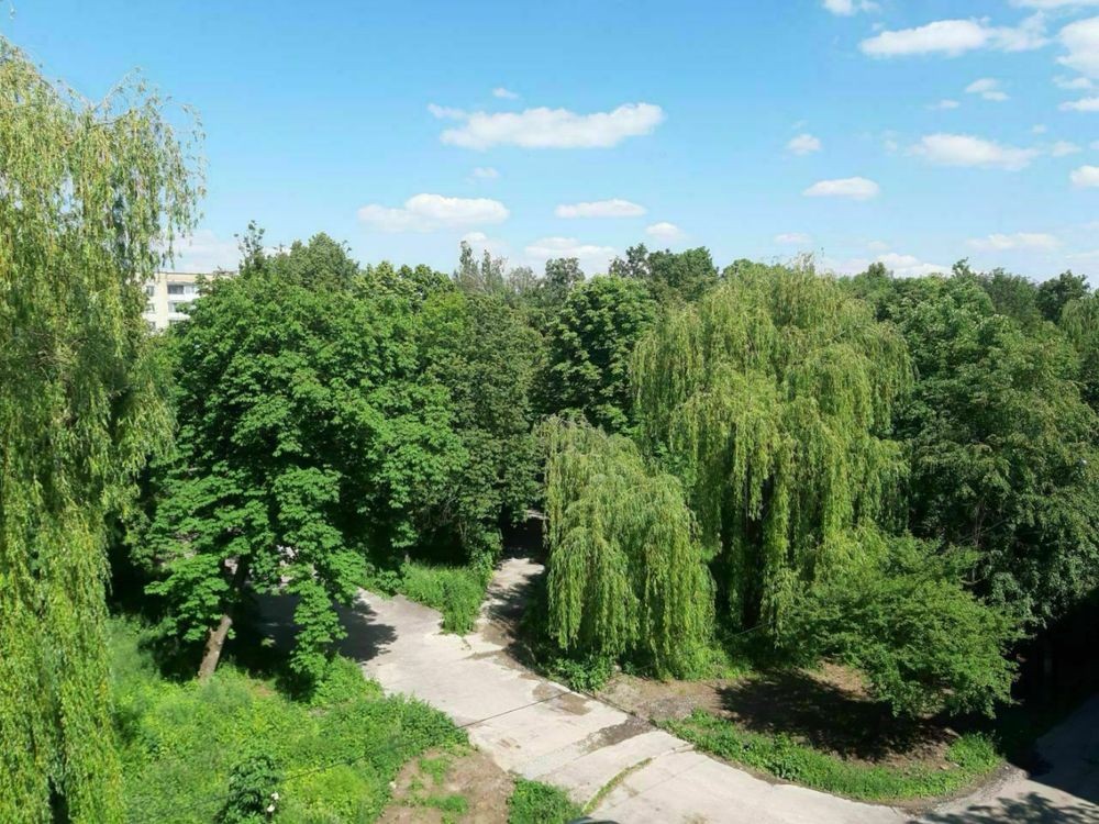 Балкон засклений з гарним виглядом на парк.