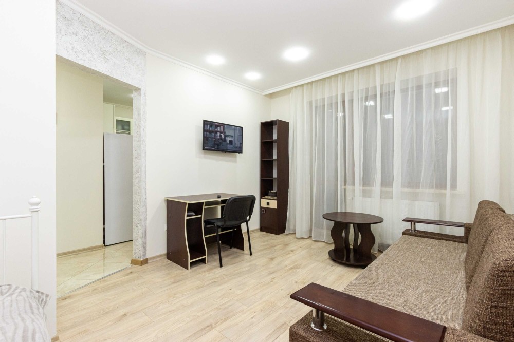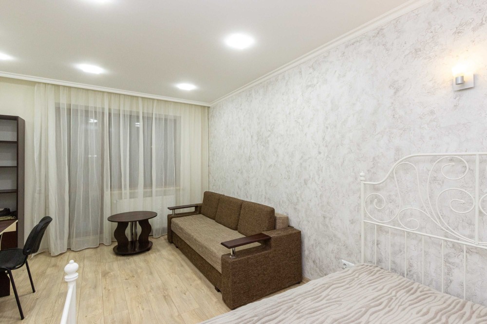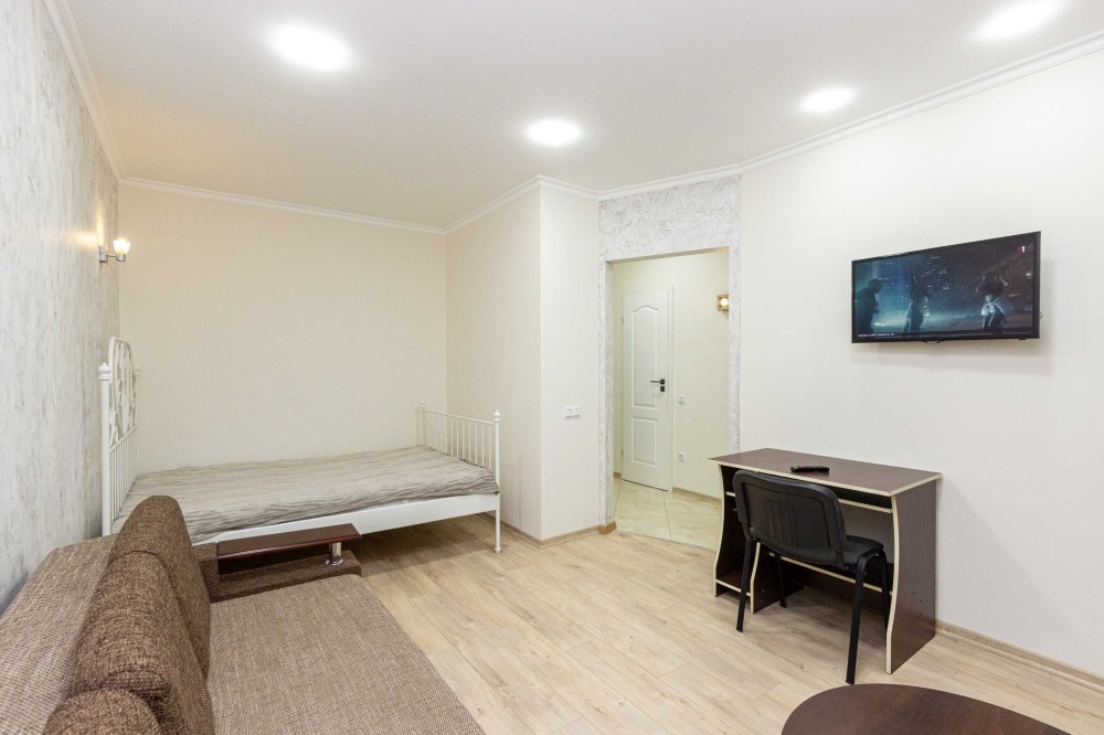 У кімнаті не тільки велике двоспальне ліжко, на якому так зручно засинати, а і розкладний диван. Навпроти на стіні плазмовий телевізор - переглядайте улюблені фільми чи телепрограми після складного робочого дня. Там і робочий стіл зі стільцем, щоб Ви мали місце та можливість працювати з дому або займатися важливими паперовими справами.