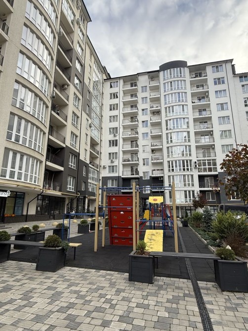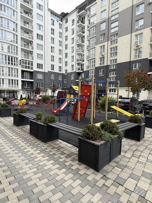 У дворі сучасний дитячий майданчик.