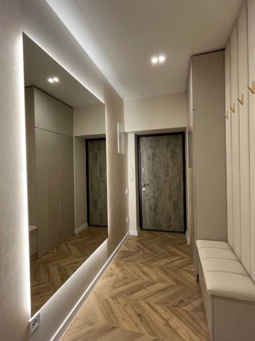 У просторому коридорі розміщено велику шафу-купе, дзеркало з підсвіткою та дзеркальні полички.