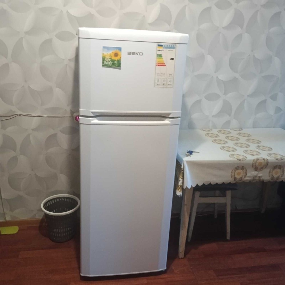 У кімнаті є холодильник, розкладний диван, журнальний столик, комод. холодильник в комнате