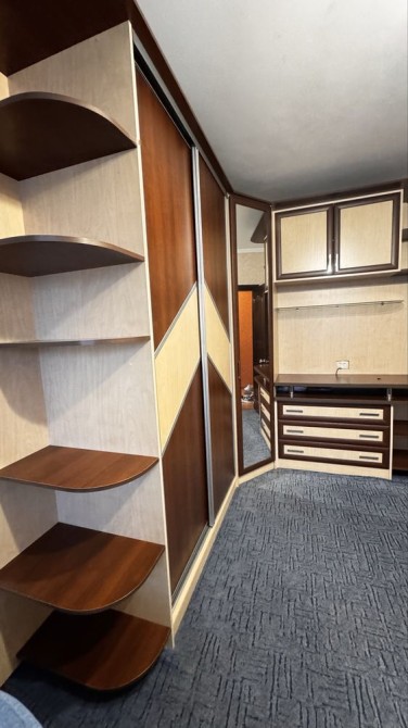 У кімнаті — великий двоспальний диван, кутова шафа-гардеробна, достатньо місця для зберігання без перевантаження простору.