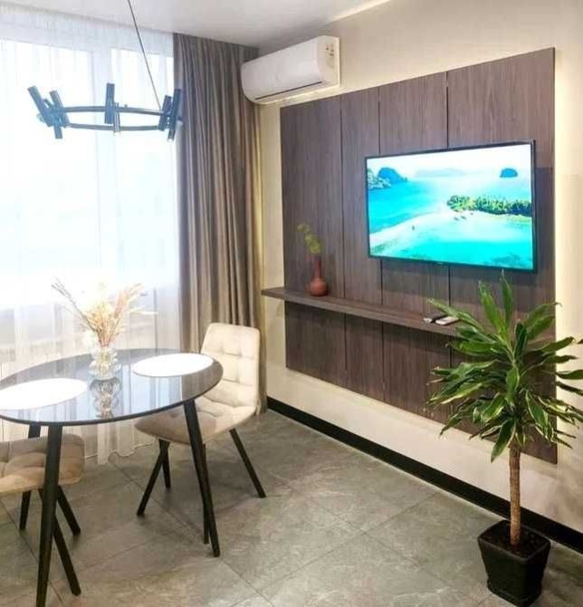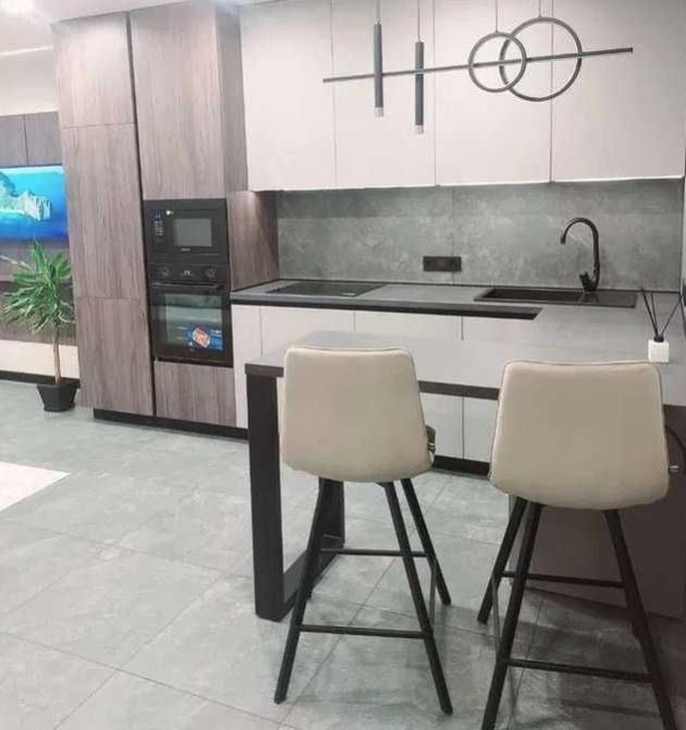 Квартира повністю укомплектована сучасною технікою для комфортного проживання — два смарт-телевізори, два інверторних кондиціонери з функцією тепла та холоду, посудомийна машина, а також прально-сушильна машина.