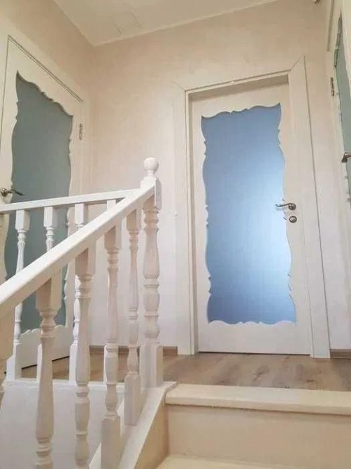 На другому поверсі спальня з виходом на лоджією з підігрівом. Яскраве колірне рішення стін мармуру кольору Тіффані, багато шафок, шафа гармошка під онікс. Вид з вікна на озеро.