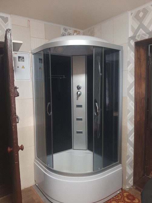 Є все необхідне: холодильник, бойлер, душова кабіна і кухня в кімнаті.