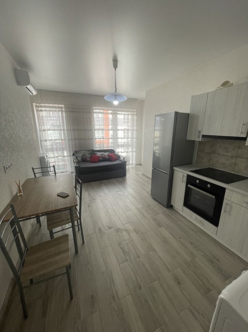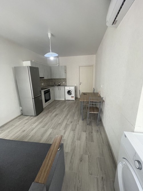 Кухня-студія з новим розкладним диваном, пральною та сушарною машинками, кондиціонером, великим холодильником, варильною поверхнею та духовою шафою.