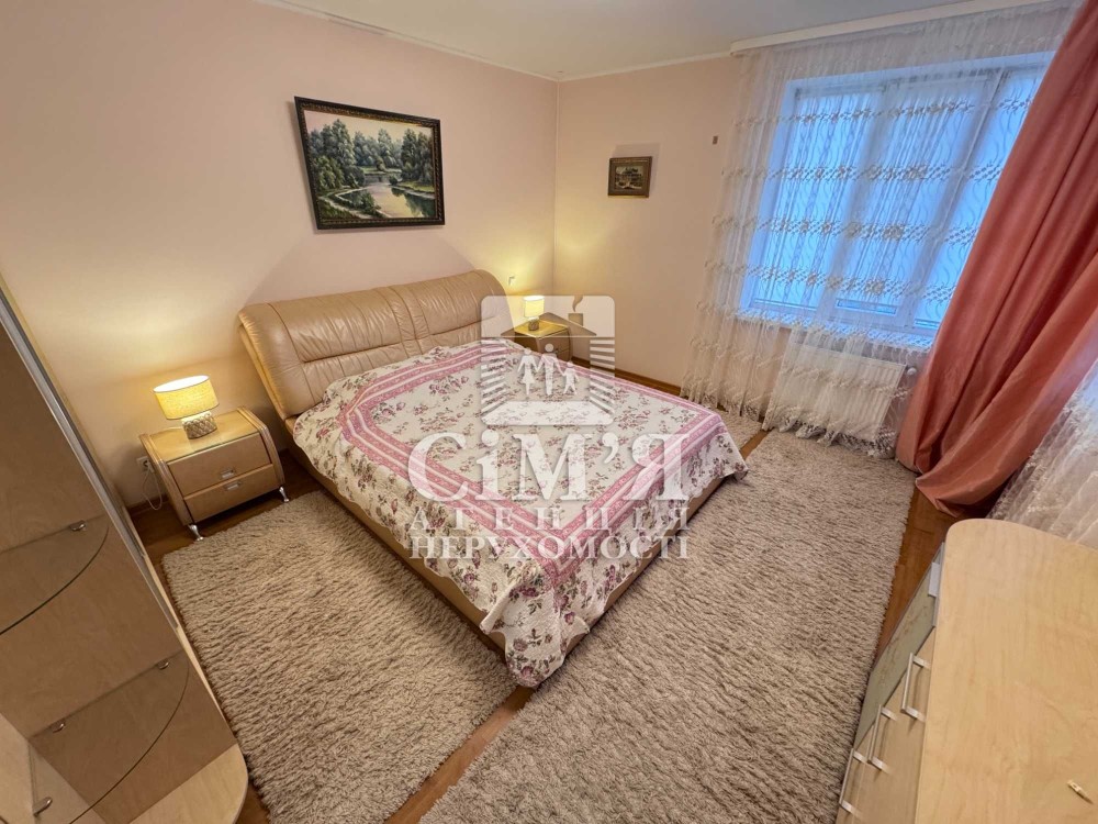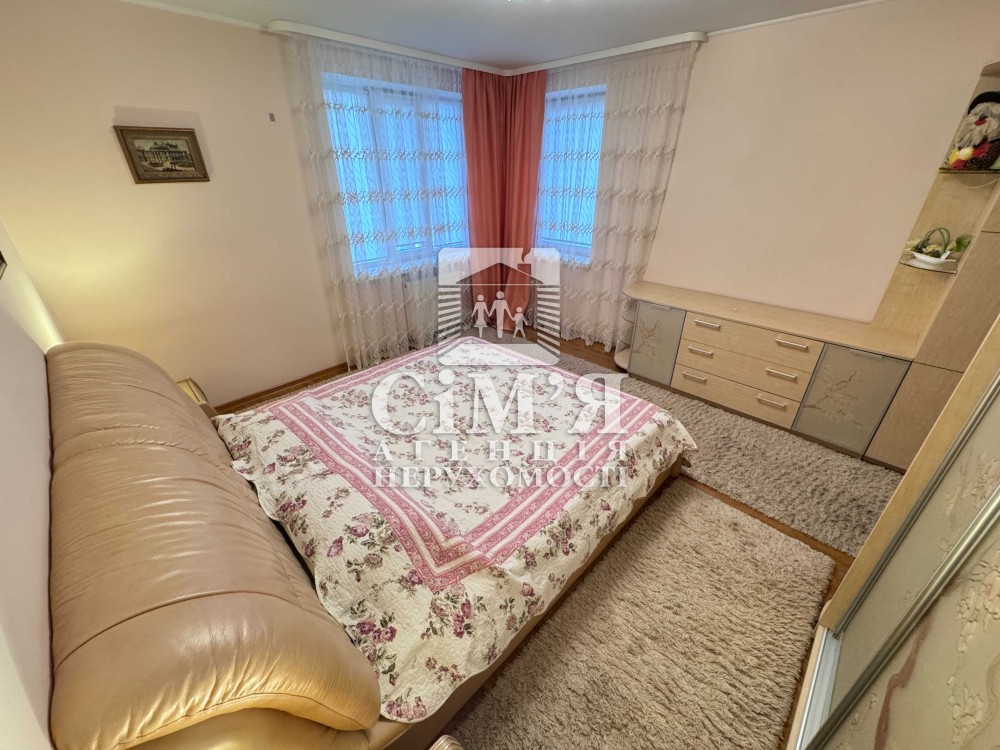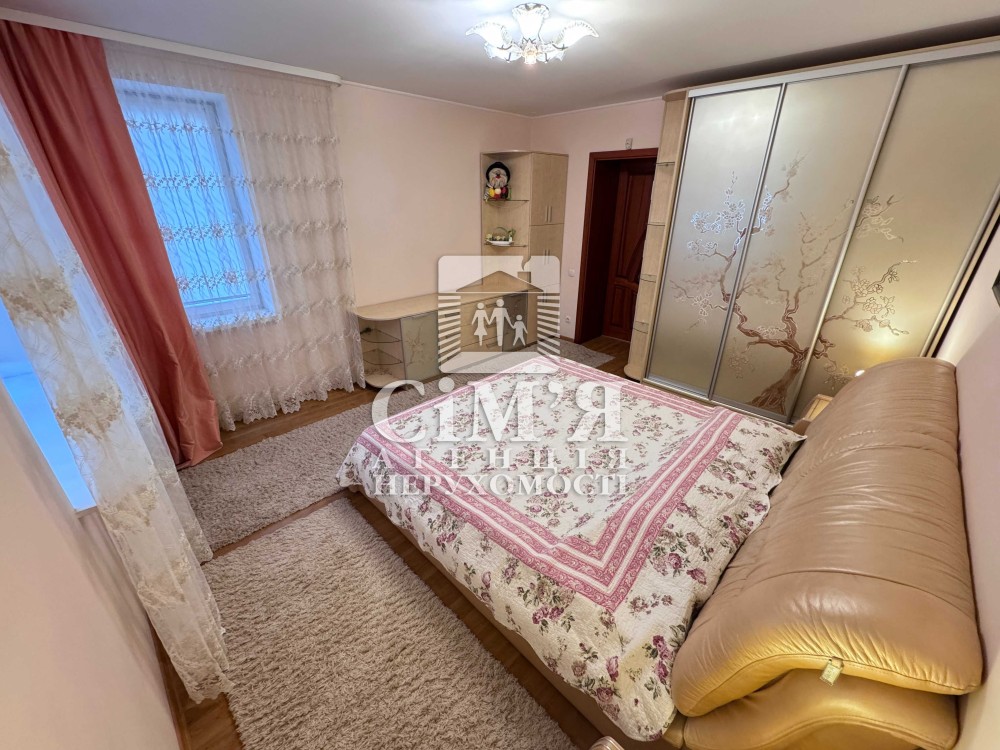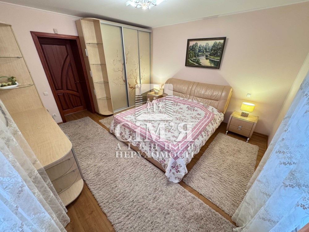 У спальні двоспальне ліжко з ортопедичним матрацом, тумби, комод, містка шафа.