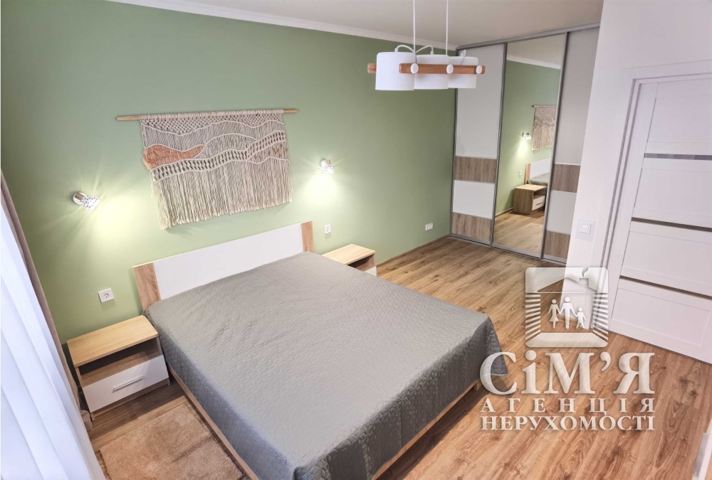 В кімнаті - комфортне двоспальне ліжко з ортопедичним матрацом, при ліжкові тумби, містка шафа-купе з трьома розсувними дверима, навпроти ліжка розмістили стінку з телевізором.