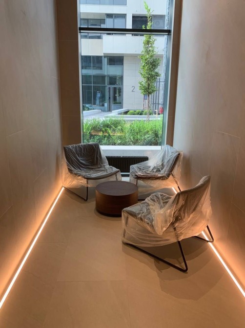Є підігрів підлоги, міні кухня, виводи під осмос для води,, виводи під проектор, вбудована шафа для речей, декоративна підсвітка стін і є кілька варіантів освітлення