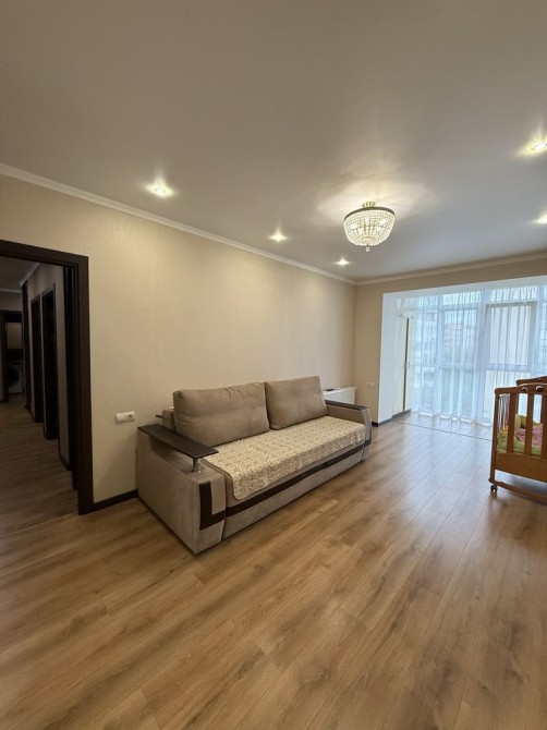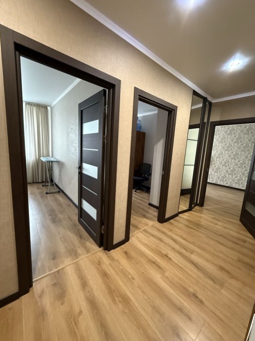 3 окремі кімнати та велика кухня. Також в квартирі великий санвузол. Тепла підлога у кухні, санвузлі і кімнаті.