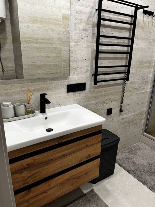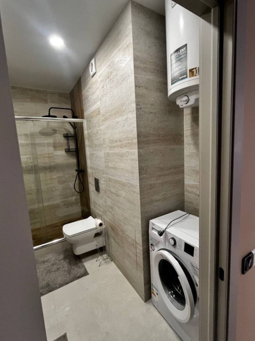 У санвузлі душова кабіна , умивальник, дзеркало з LED підсвіткою, унітаз, рушникосушарка та пральна машина.