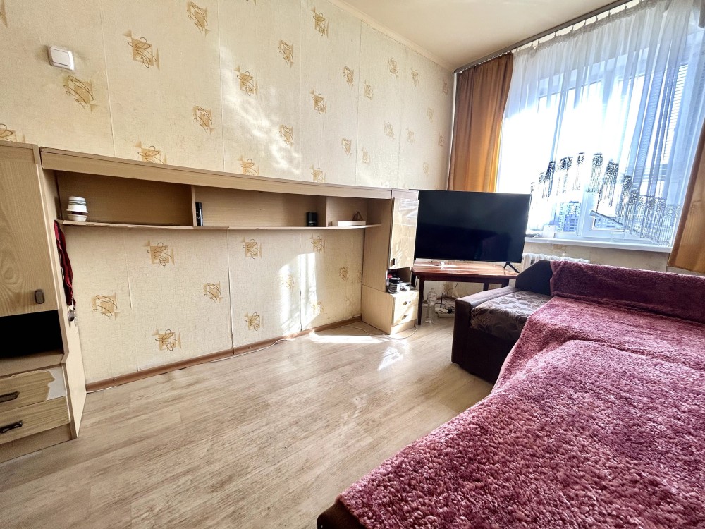 У кімнаті – шафа, розкладний диван, меблева стінка, столик, телевізор.