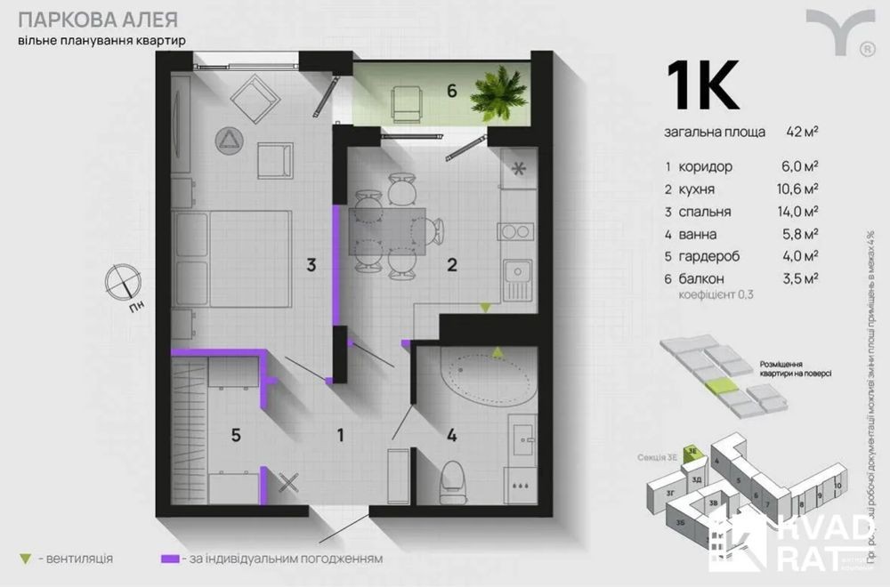 • Общая площадь 42 м2