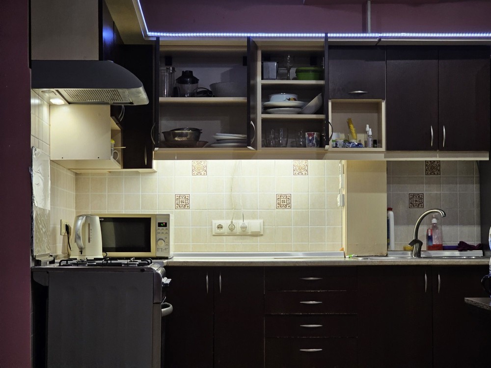 На кухні є весь посуд: ложки, виделки, ножі, каструлі, сковорідки, кружки, тарілки. Багато освітлення створює відчуття простору та затишку. Є вихід на другий закритий балкон.