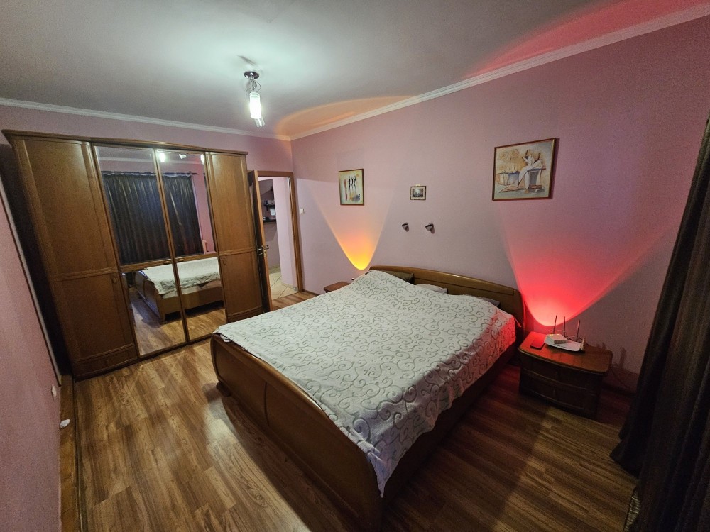 Простора та затишна спальня з великим двоспальним ліжком, місткою шафою з дзеркалом та виходом на балкон. Балкон облаштований двома зручними кріслами — ідеальне місце для відпочинку з кавою або вечірніх посиденьок.