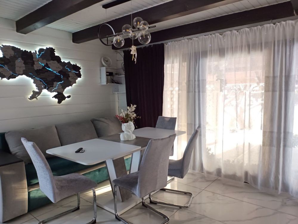 Код объекта 215 Сдается в посуточную аренду уютный современный дом с красивым зеленым участком. Тихий двор с прекрасным садом, просторная летняя терраса и мангальная зона для отличного времяпровождения с семьей и друзьями. Рядом с домом пляж, река Десна, лес. Самое удачное место для отдыха на природе. Дом с отличным современным ремонтом, пять раздельных спален, большой зал с камином, два санузла, 14 спальных мест. Есть все необходимое для комфортного проживания. дом может разместить максимально до 20 человек днем и до 14 на ночевку Заезд 14:00 выезд 12:00 цены зависят от количества людей: с пн по чт от 10000 грн в выходные от 13000 грн