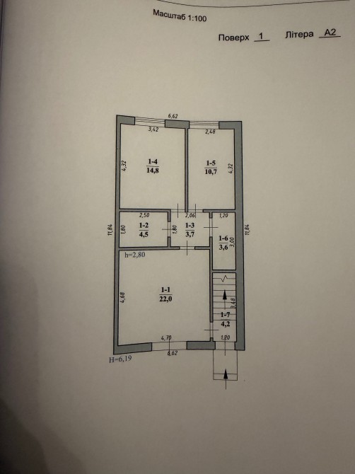 1 поверх — кухня-вітальня 22 м², 2 кімнати, санвузол, кладова