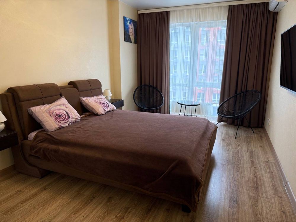 Київ, метро Позняки, Драгоманова 40е, 3-х кімнатна квартира. Драгоманова 40е, 24-й поверх, простора видова квартира 3-х кімнатна, з сучасним якісним ремонтом. Загальна площа 105.5, житлова 54.4. Комора, гардероб. Повністю укомплектована меблями. Вбудована кухня з необхідною побутовою технікою, натуральна столярка, німецький дубовий паркет, кахель з підігрівом, встановлені фільтри на воду, бойлери на кухні та в коморі, інверторні кондиціонери, нові ТV, велика лоджія з підігрівом, чудовий краєвид на місто. "Добробут", супермаркети, два ліцеї, "Спортлайф", поряд парк із озером та зоною відпочинку, до М "Позняки" - 10 хвилин пішки. Все лишається у квартирі. 044 200 10 80