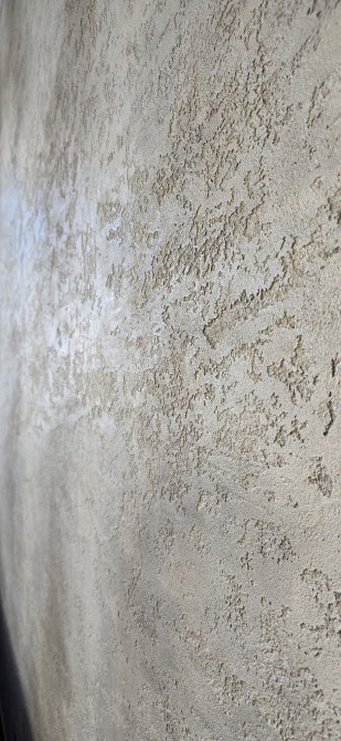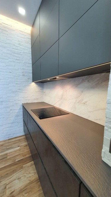 Декаротивна штукатурка Travertino Кухня обладнана всією вбудовуваною побутовою технікою: варильна поверхня, мікрохвольова піч з великим об'ємом, духова шафа, холодильна камера, морозильна камера, посудомийна машина, пральна машина 2в1 з сушилкою, місце для кавової машини з додатковим виведенням води. Фасади з преміальної кераміки Laminam (Італія) та МДФ Rehau Brilliant. Комплектуючі Blum, у ящику для посуду встановлений електропідйомник.
