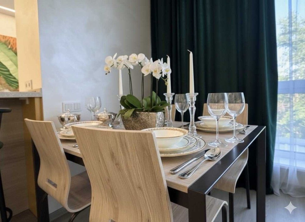 - Раціональне планування: передпокій, великий санвузол із душем, дві гардеробні для ваших речей, простора спальня з королівським ліжком, кухня-вітальня із зручним диваном і робочим місцем