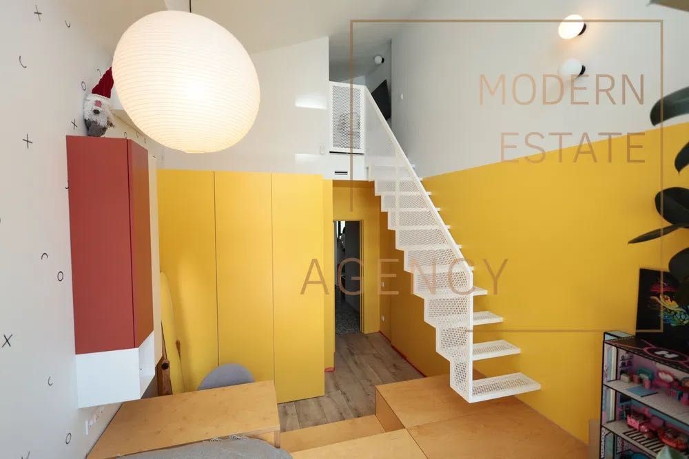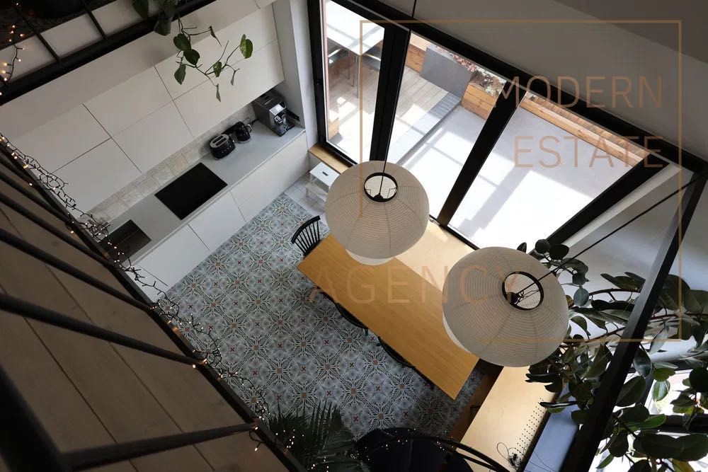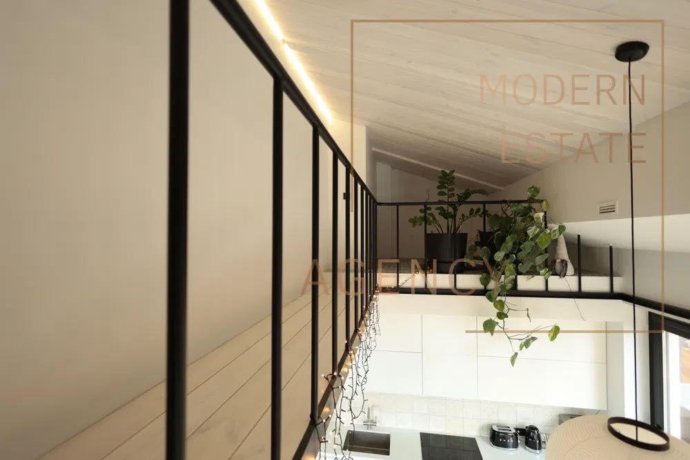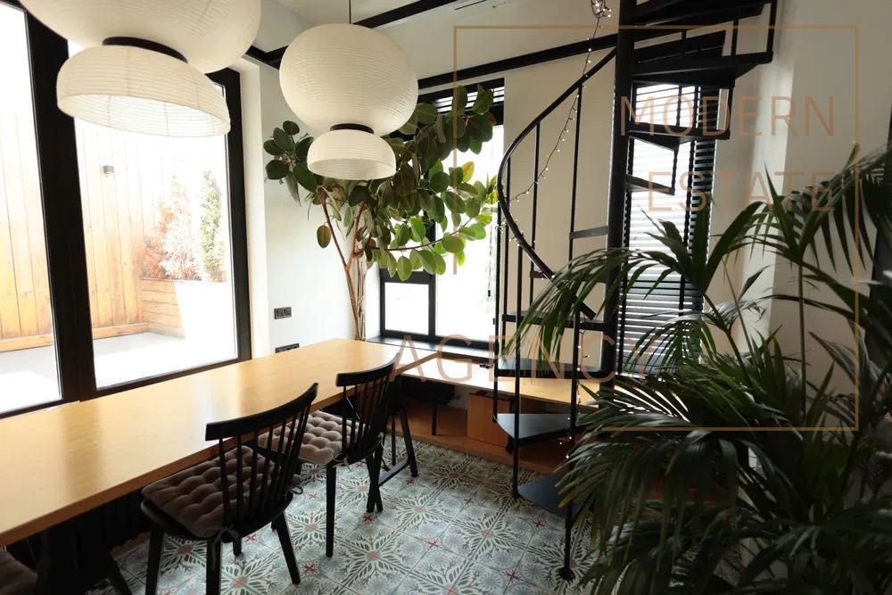 Простора кухня-вітальня з другим світлом та винтовою дизайнерською драбинкою на другий рівень (зона для кабінету, лаунжу або комори)