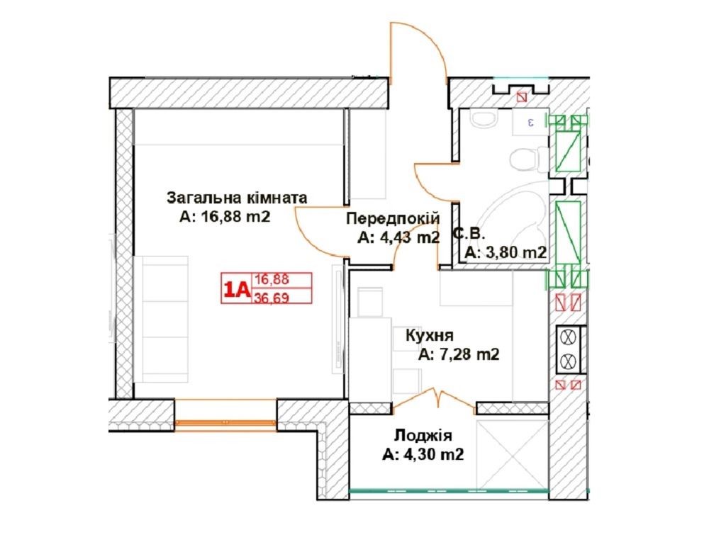 Загальна площа квартири: 37 м2