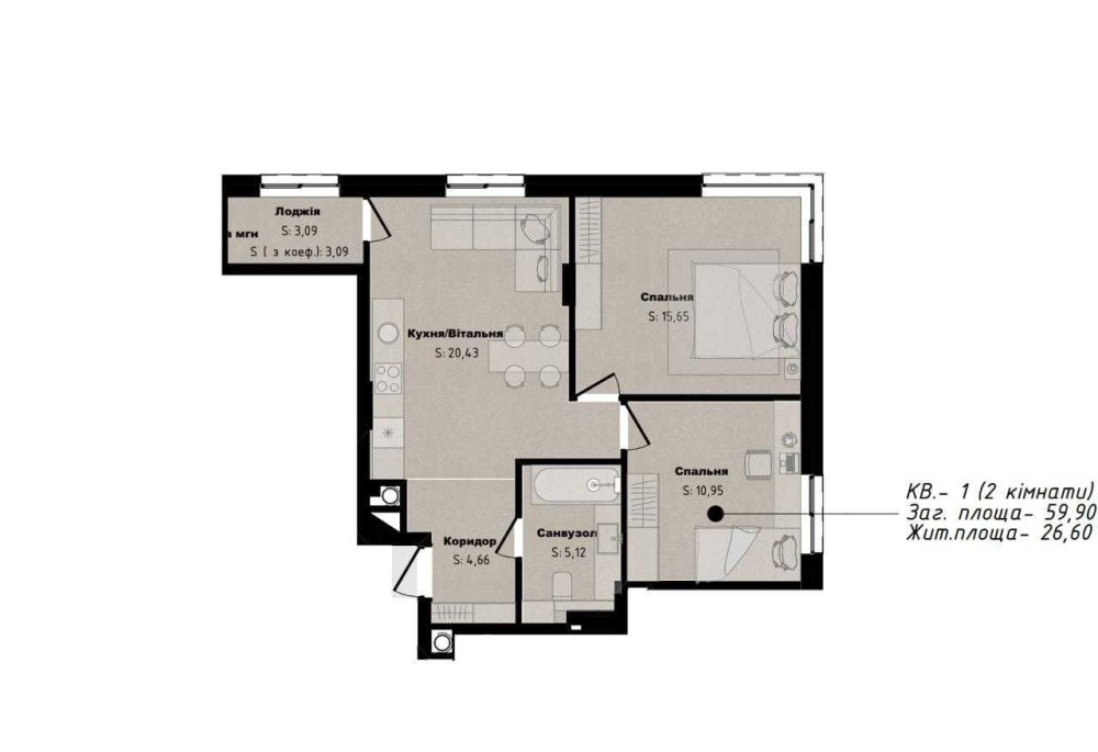 Засклена лоджія, кухня-вітальня площею 20.4 м.кв., дві ізольовані спальні 11 та 16 м.кв., санвузол 5м.кв.