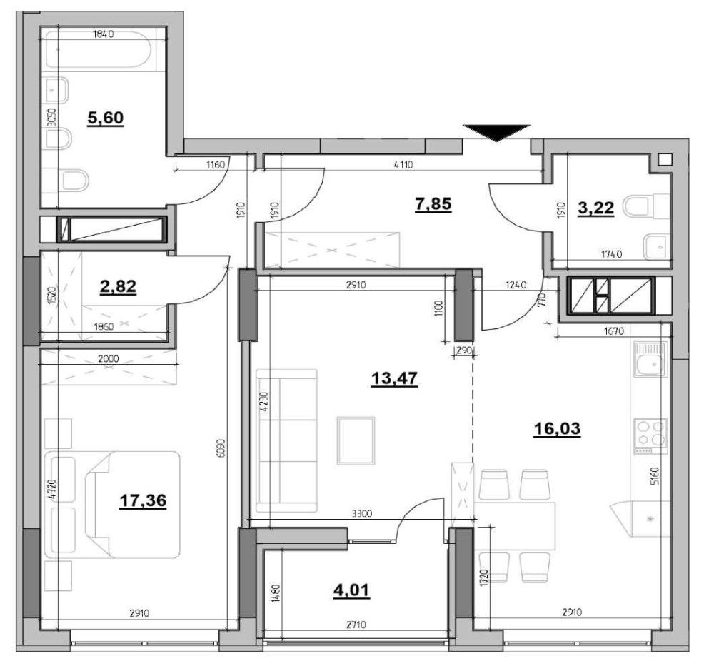 Квартира з вільним плануванням — легко спланувати повноцінну 3-кімнатну з просторою кухнею-вітальнею, двома спальнями, гардеробною, пральною кімнатою та санвузлом.