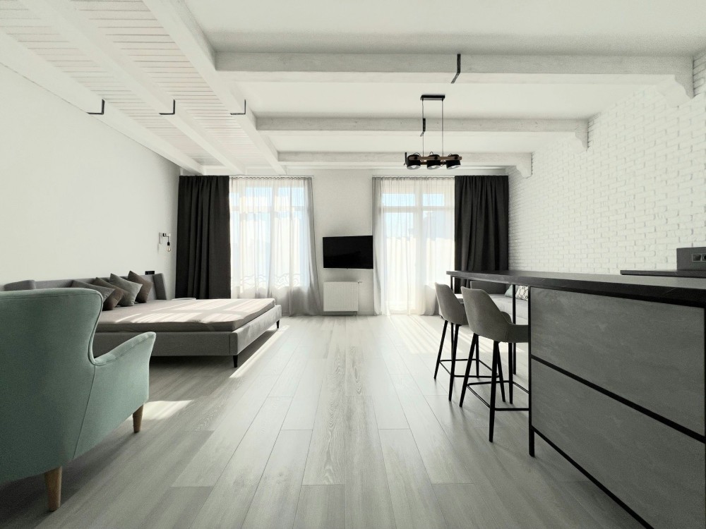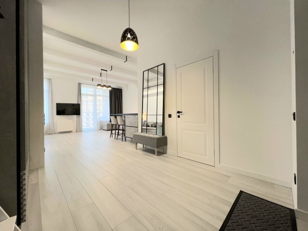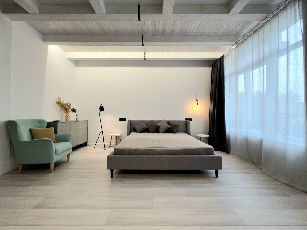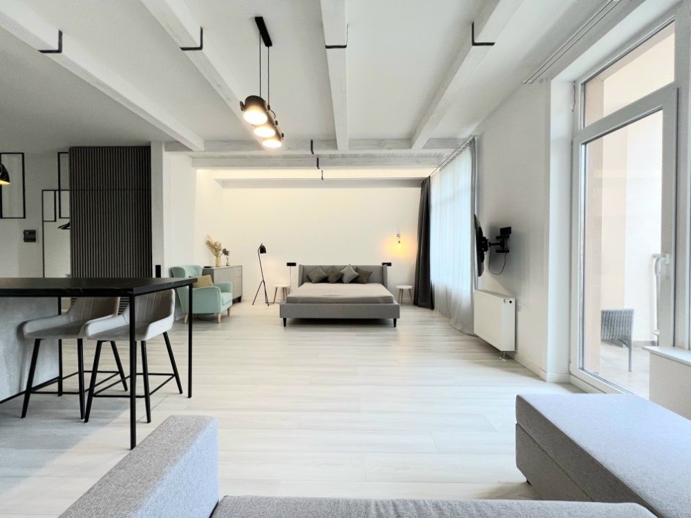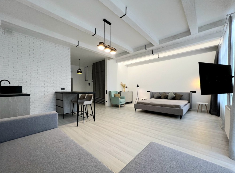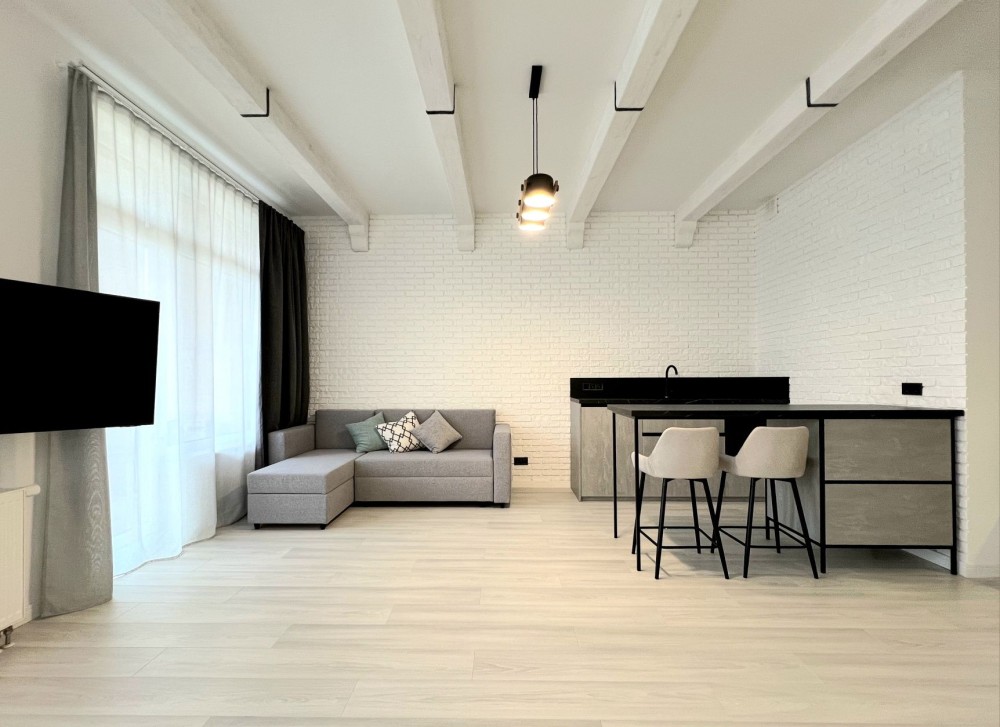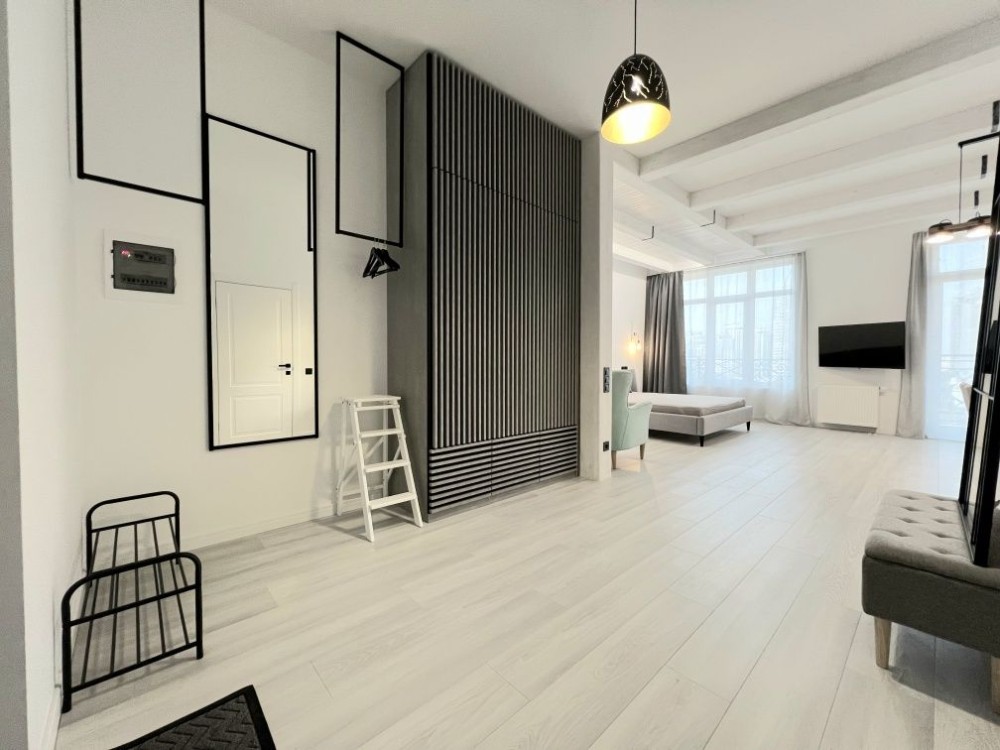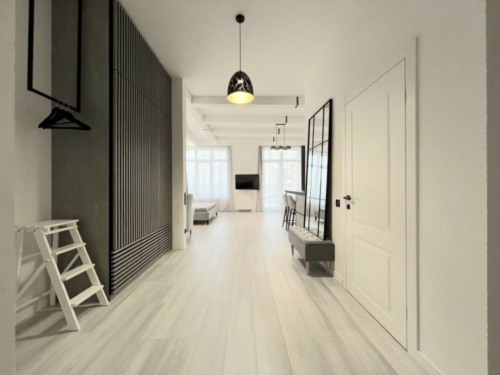 Квартира розташована на зручному 9 поверсі. Висота стелі 3м і відкрите планування створюють відчуття простору і свободи. Зроблений якісний ремонт в скандинавському стилі. Укомплектована всіма необхідними для комфортного проживання меблями і технікою, двоспальне ліжко з ортопедичним матрасом, двоспальний диван, великий телевізор, кондиціонер, вбудованя кухня з духовою шафою і посудомийною машиною, холодильник, пральна машина, велика шафа.