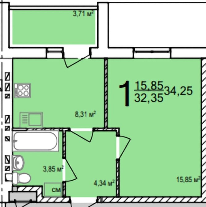 • Общая площадь 34.25 м2