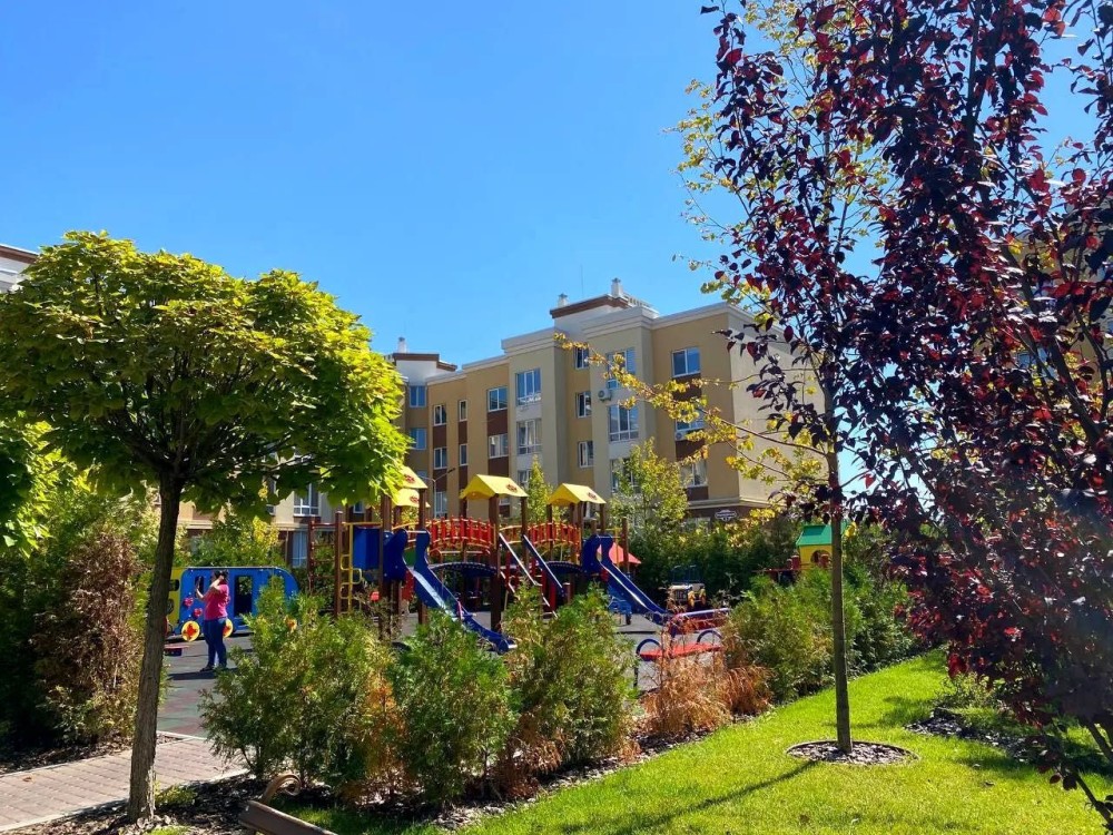 У дворі дитячий майданчик, сучасне укриття, безліч секцій для діточок.