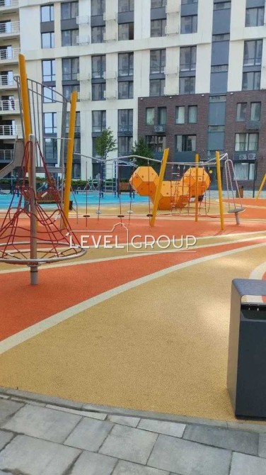 Закритий двір без машин з ландшафтним дизайном, дитячими майданчиками, зонами відпочинку та спортивним обладнанням.