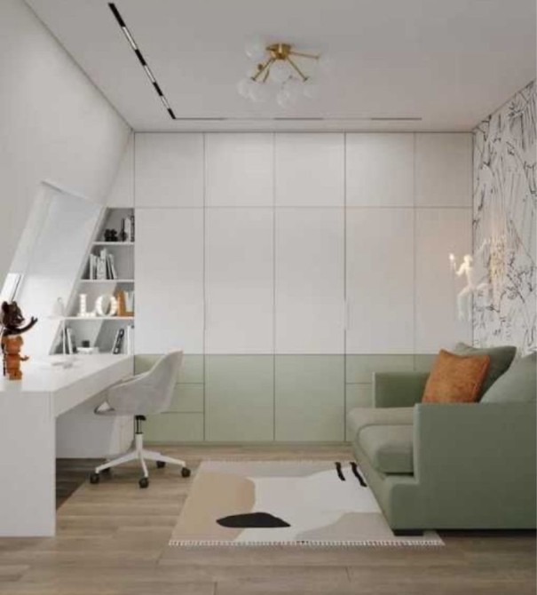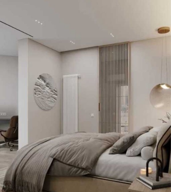 - мастер-спальня с санузлом, гардеробом, панорамными окнами, местом для рабочего стола и выходом на большой балкон