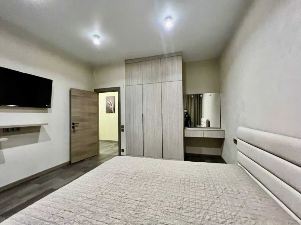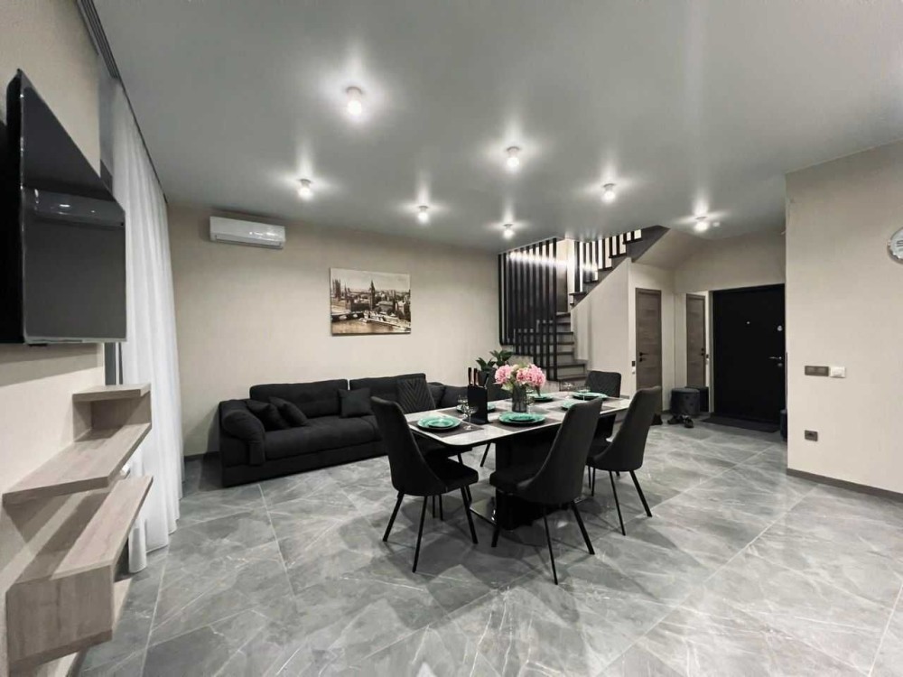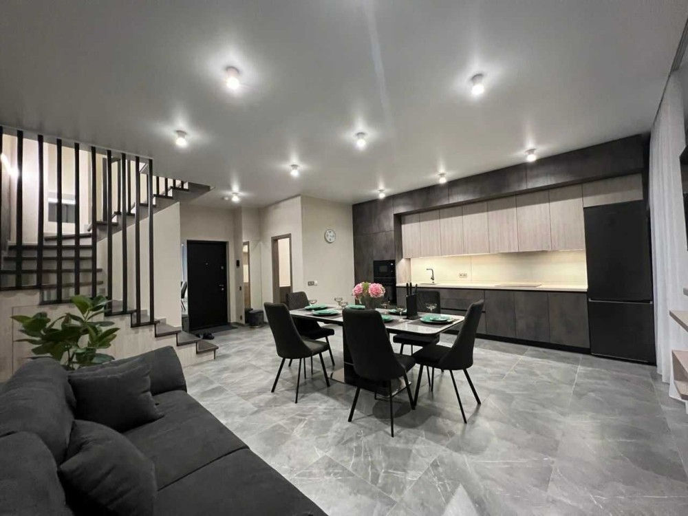 На першому поверсі знаходиться кухня-вітальня зі всією технікою: посудомийна машина, варильна поверхність, духова шафа, мікрохвильова піч, холодильник, кондиціонер, телевізор. Гардеробна кімната та туалет, підігрів підлоги.