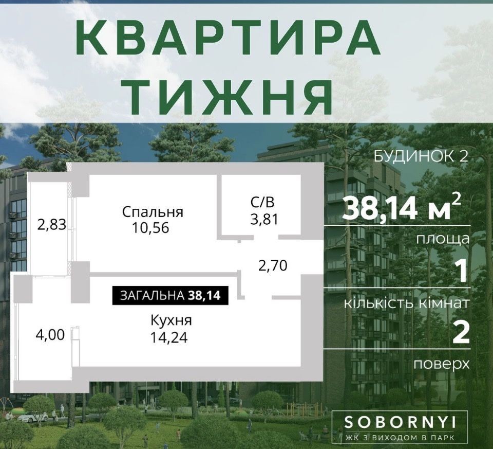 Цього тижня 1-кімнатна квартира площею 38,14м², розташована на 2-му поверсі будинку №2 ЖК"Sobornyi", Гостомель!