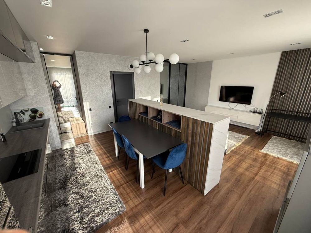 Квартира знаходиться на 2-му поверсі (43 м²). Повністю вмебльована, з преміум-технікою Franke. Є гардеробна, окремий шкаф для верхнього одягу, балкон із заскленою нішею, пральна машина з сушкою, бойлер, тепла підлога та індивідуальне електроопалення. Встановлений фільтр для питної води Zepter.