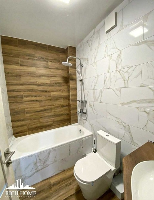 Санвузол поєднаний, облицювання плиткою, встановлена ванна.