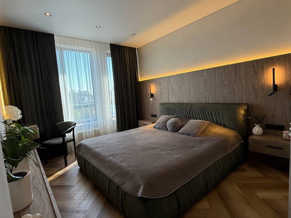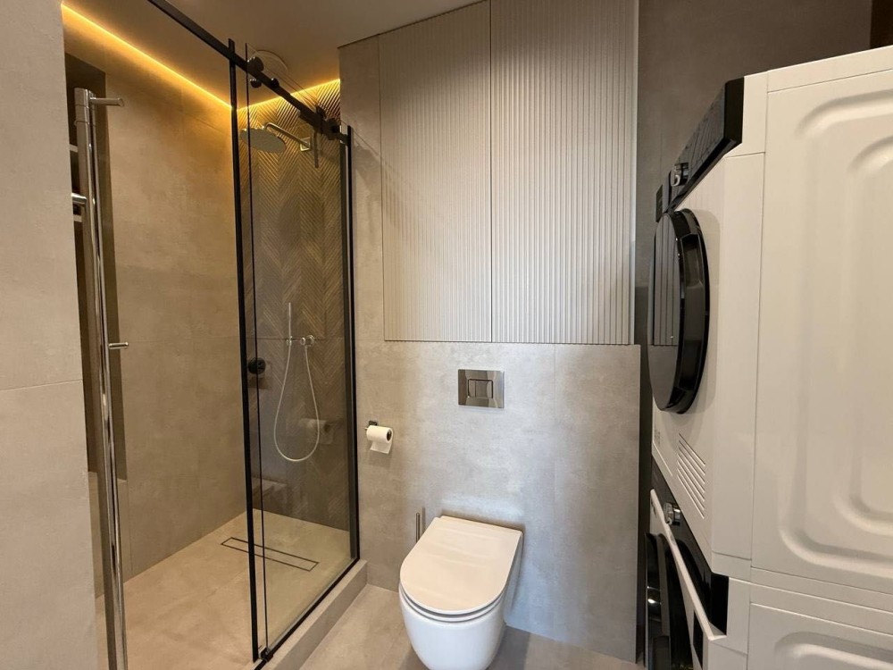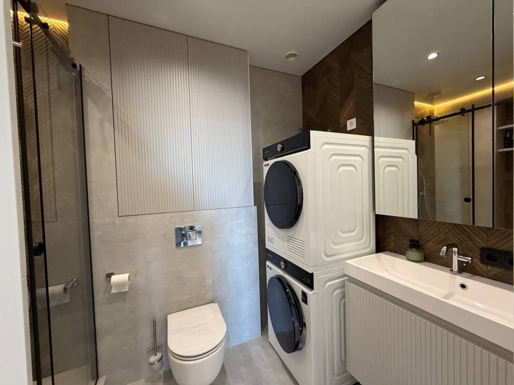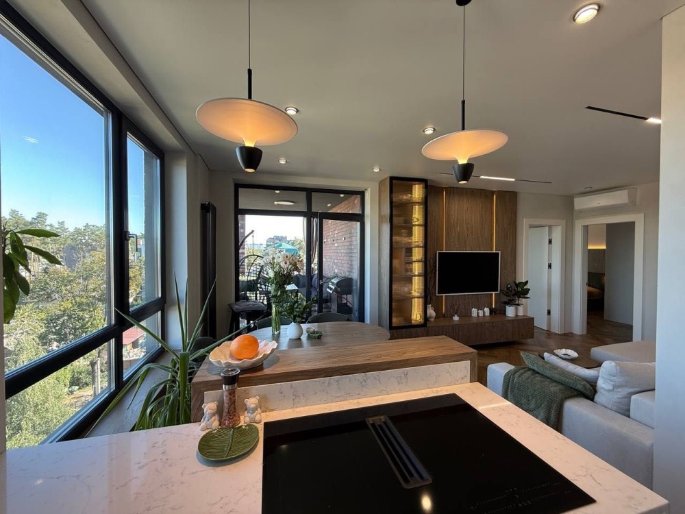 Встановлена спліт-система на 2 кондиціонери CH з підтримкою wifi, Пральна та окремо сушильна машина Samsung, з підтримкою wifi, Вся сантехніка Grohe/Hansgrohe, Холодильник вбудований 900см, Подрібнювач відходів, Система очистки води осмос, Робоча зона і фартух кухні виконані з кварцевого каменю, Штора з електроприводом, Є змога підключити резервне живлення на освітлення.