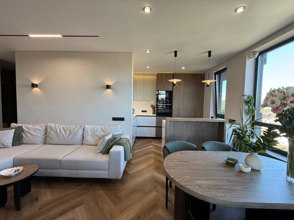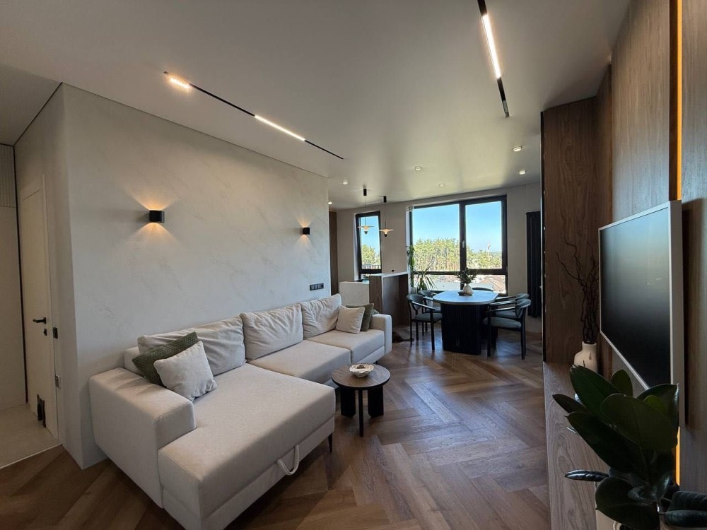 Велика кухня-вітальня, дві повноцінні спальні кімнати, гардероб в двух спальнях, два санвузли (душова, ванна), Видова укомплектована тераса.