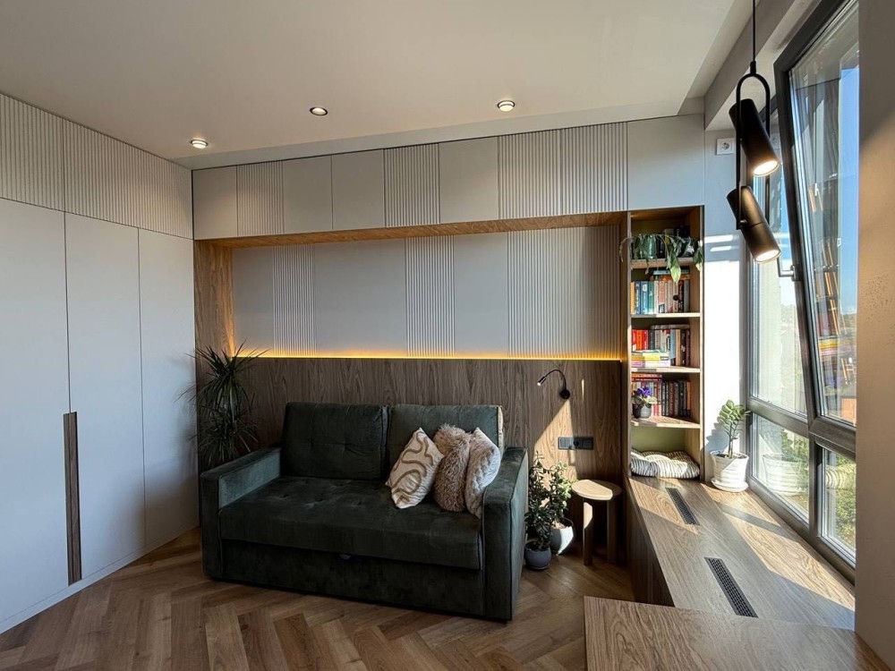 Опис: Стіни - декоративна штукатурка, Підлога встелена кварц-вінілом Швейцарського виробництва, Стінові панелі і меблі - італійський шпон, Двері і фасади - мдф фарбований, Магнітні стопори на дверях, Електрофурнітура німецького виробника Berker, Вся фурнітура Blum з дотягами, Техніка на кухні Bosh, плита AEG з вбудованою витяжкою.