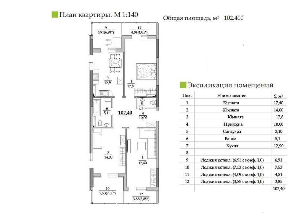 102,4 кв.м2 проактивне планування (кухня-вітальня та 3 спальні
