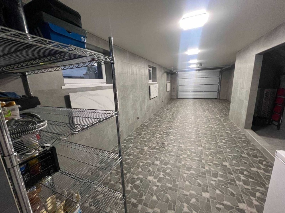 Перший рівень гараж(теплий) 44м2, на дві машини, комунікації(Тепловий Насос Електролюкс, резервний котел Вайлент, автомати, гребінки, розширювальні баки, 300 літровий бойлер для води, фільтра і т.д.