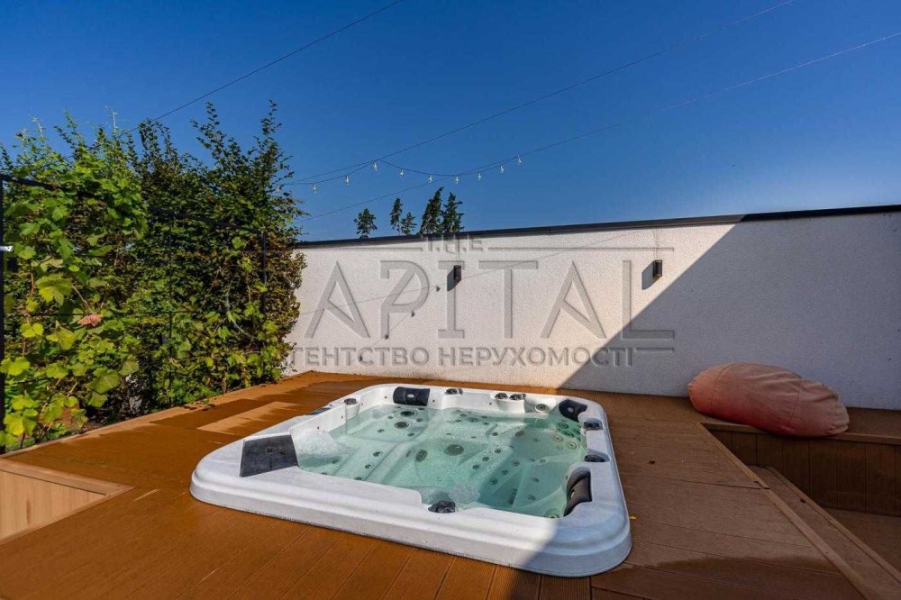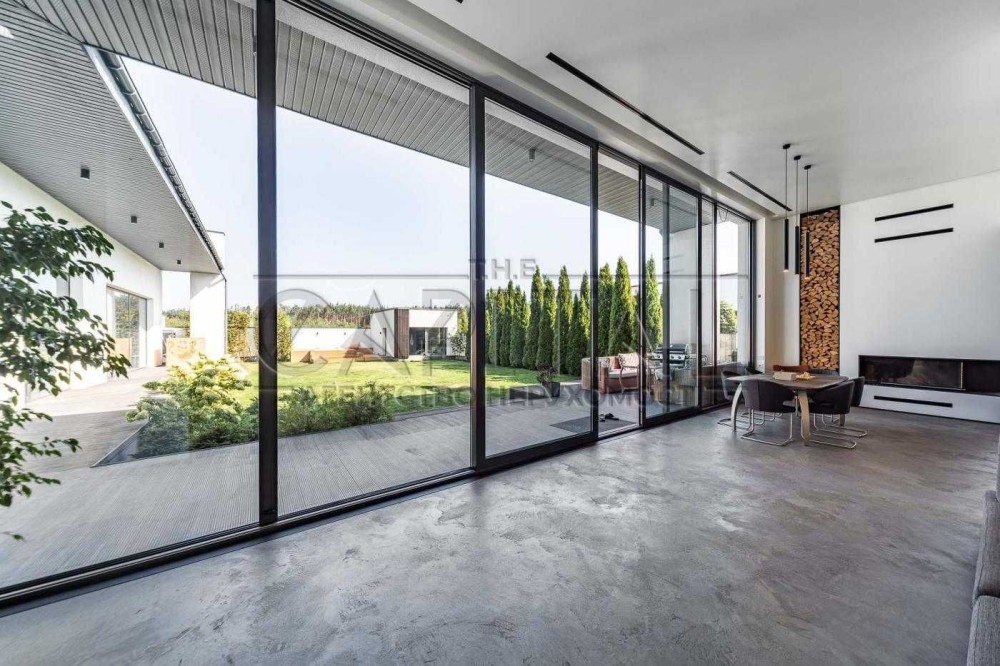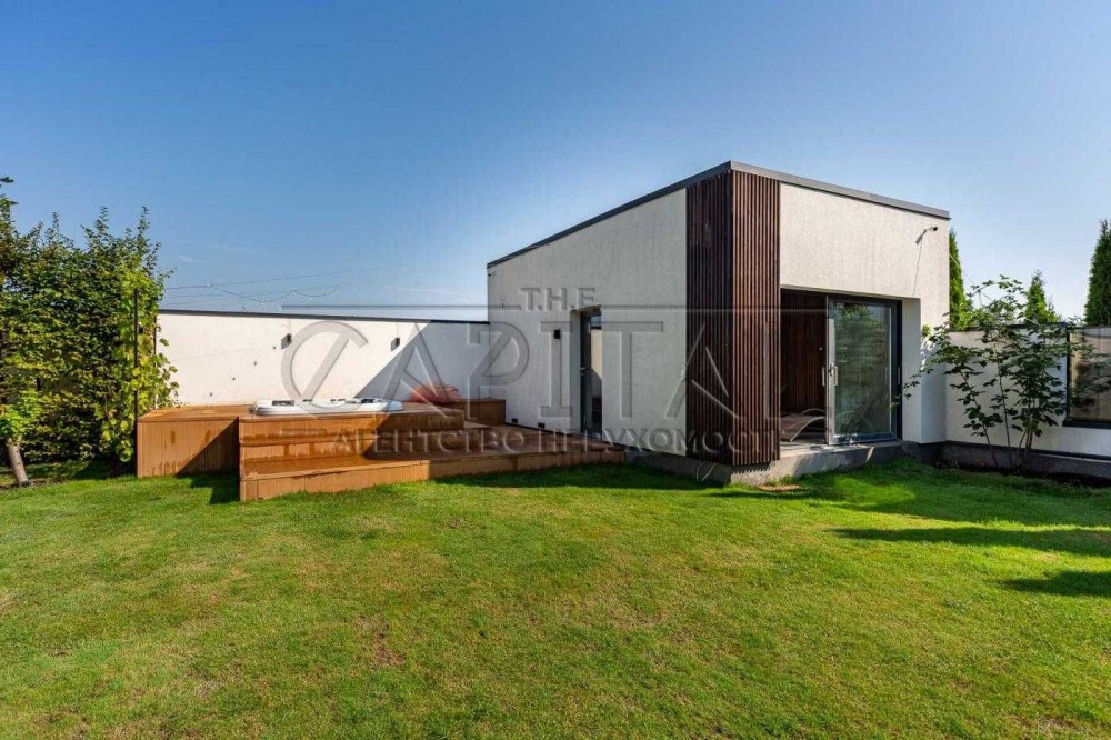 На ділянці розташований будинок з терасою (100м2), гараж, сауна і джакузі під відкритим небом. Приміщення в котеджі вражають своєю відкритістю та простором, завдяки високим стелям (4 м) та великим панорамним вікнам в кожній кімнаті.